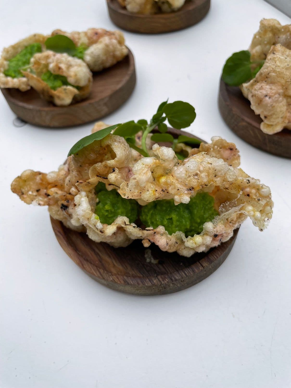 Venø oysters with seaweed roe and rosehip, accompanied by apple cubes with lemon and elderflower oil.